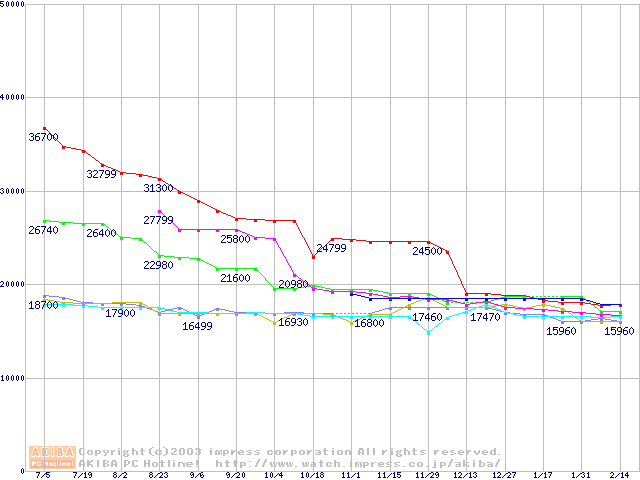 | [↓次グラフ]: | 2.5インチHDD主要製品(最安値2万円~3万円未満)の最安値推移 |