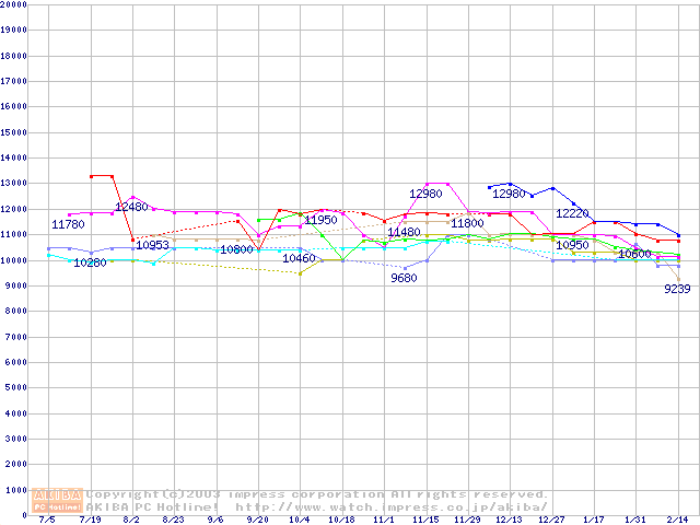 | [↑前グラフ]: | 2.5インチHDD主要製品(最安値2万円~3万円未満)の最安値推移 |