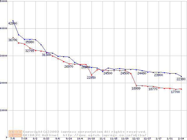 | [↓次グラフ]: | 2.5インチHDD 60GB~80GB未満(9.5mm厚,4200rpm)の最安値推移 |