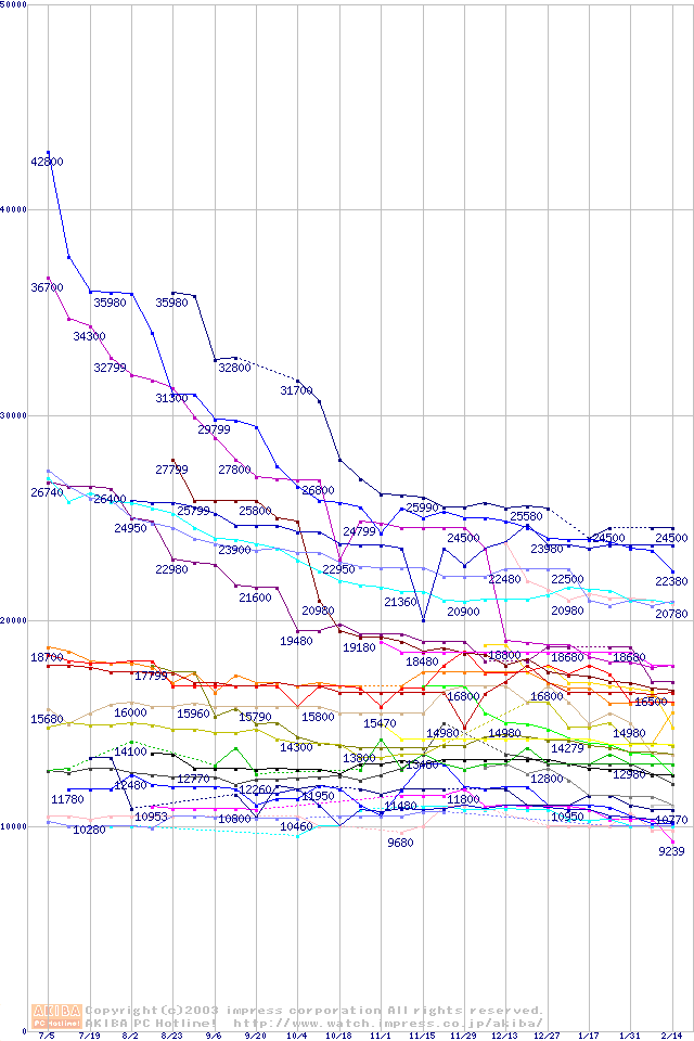 2.5インチHDD 80GB以上(9.5mm厚)の最安値推移
