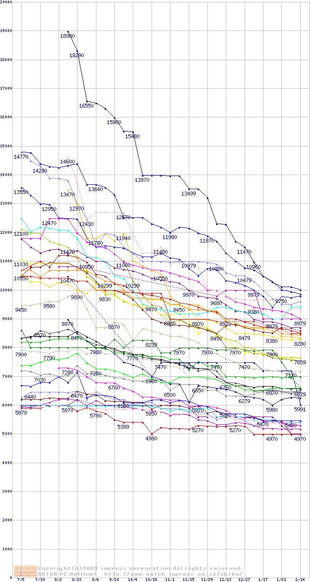 HDD主要製品(最安値1万円~1万5千円未満)の最安値推移