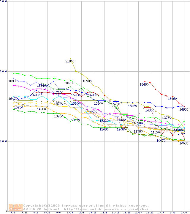 HDD主要製品(最安値1万5千円~2万円未満)の最安値推移
