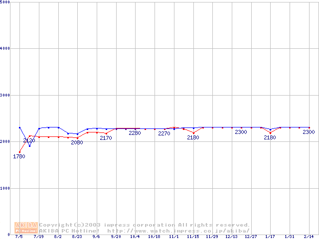 メモリ主要製品(最安値5千円未満)の最安値推移