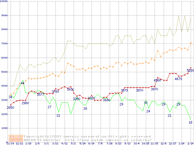 PC100 SDRAM DIMM CasLatency=2の最安値推移
