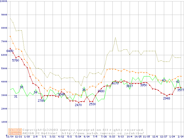 メモリ主要製品(最安値5千円未満)の最安値推移