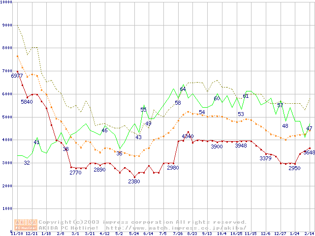 PC2700(DDR333) DDR SDRAM DIMMの最安値推移
