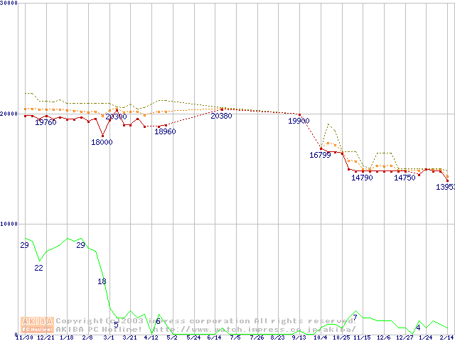 Socket 478 (micro-PGA,FSB 400MHz,L2 512KB,Northwood)の最安値推移