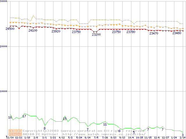 Socket 370 (FC-PGA2,FSB 133MHz,L2 512KB,Tualatin)の最安値推移