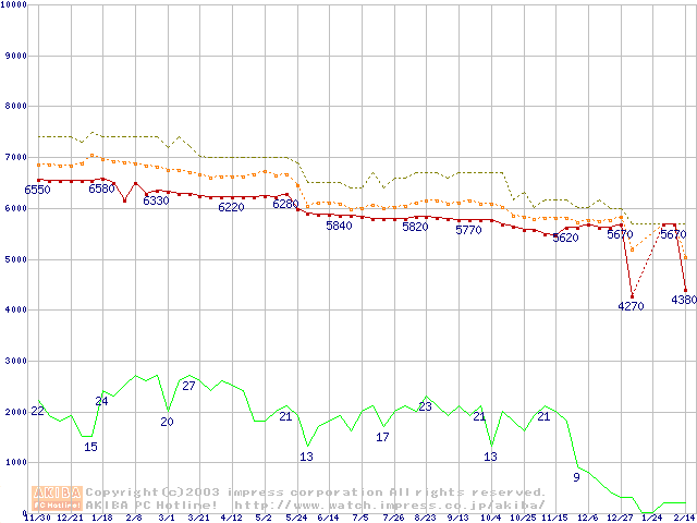 Socket 370 (FC-PGA2,FSB 100MHz,L2 256KB,Tualatin)の最安値推移