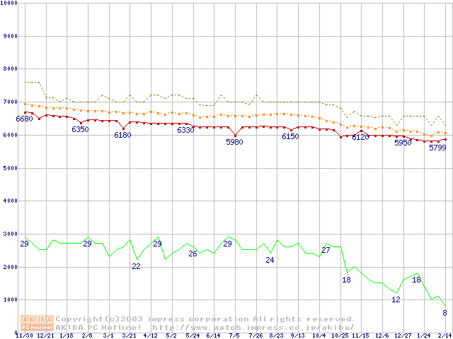 Socket 478 (micro-PGA,FSB 400MHz,L2 128KB,Willamette)の最安値推移