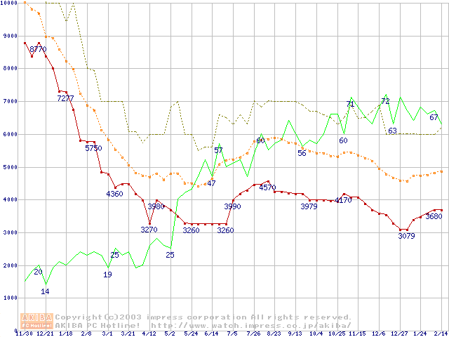 PC3200(DDR400) DDR SDRAM DIMMの最安値推移