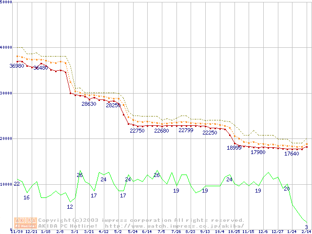 Socket 478 (micro-PGA,FSB 533MHz,L2 512KB,Northwood)の最安値推移