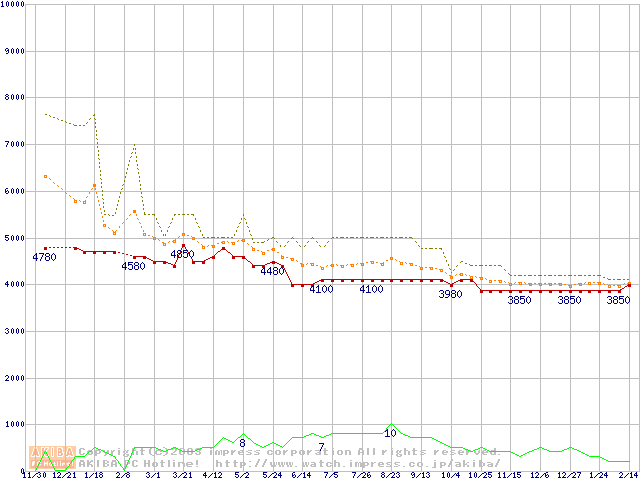Socket 370 (FC-PGA,FSB 100MHz,L2 128KB,Coppermine)の最安値推移