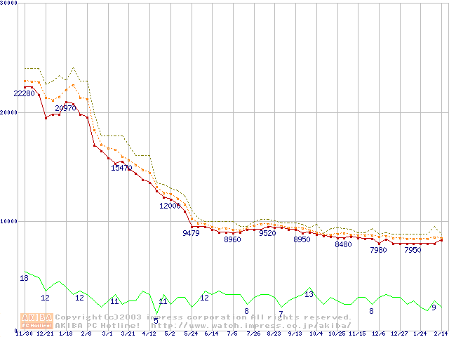 Socket A (OPGA,FSB 266MHz,L2 256KB,Thoroughbred)の最安値推移