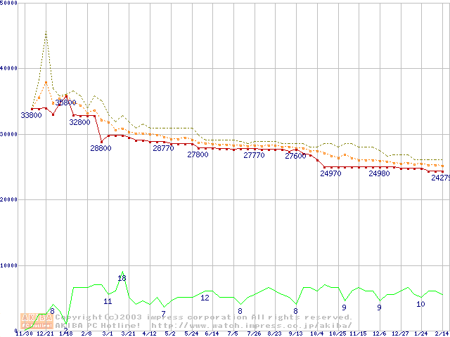 Socket 604 (micro-PGA,FSB 533MHz,L2 512KB,Prestonia)の最安値推移
