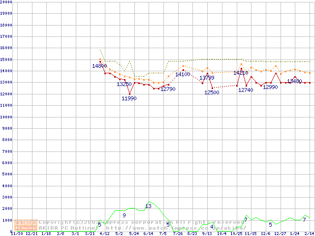 MHT20x0ATシリーズ (9.5mm,4200rpm,UltraATA/100,2MB,FDB,40GB/Platter,FDB)の最安値推移