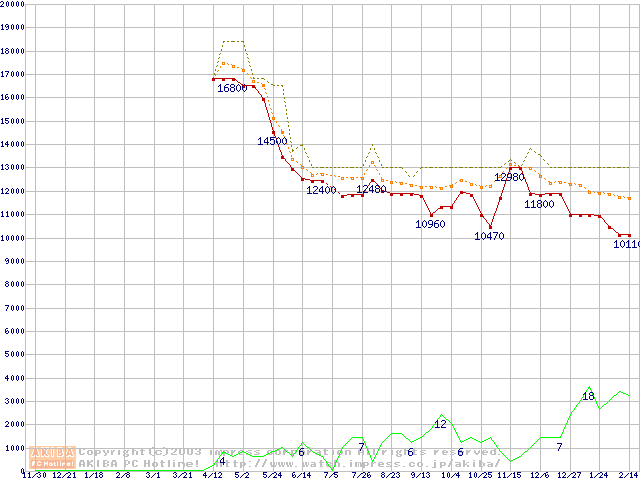 Travelstar 80GN (9.5mm,4200rpm,UltraATA/100,2MB,FDB,40GB/Platter)の最安値推移