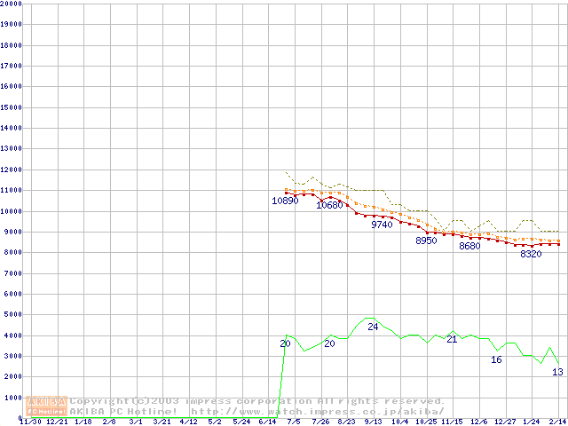 Socket 478 (micro-PGA,FSB 400MHz,L2 128KB,Northwood)の最安値推移