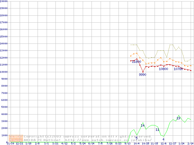 Travelstar 5K80 (9.5mm,5400rpm,UltraATA/100,8MB,FDB,40GB/Platter)の最安値推移