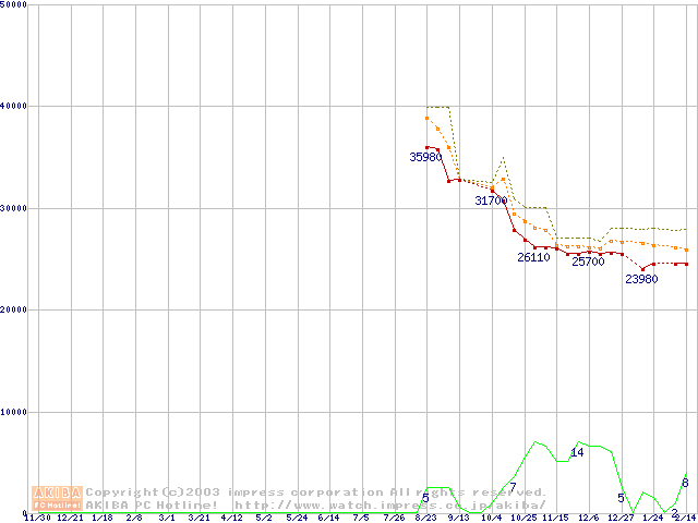 Travelstar 5K80 (9.5mm,5400rpm,UltraATA/100,8MB,FDB,40GB/Platter)の最安値推移