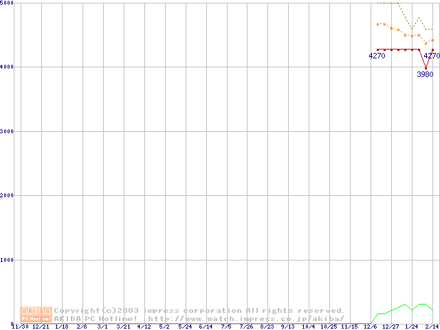 Socket 370 (FC-PGA2,FSB 100MHz,L2 256KB,Tualatin)の最安値推移