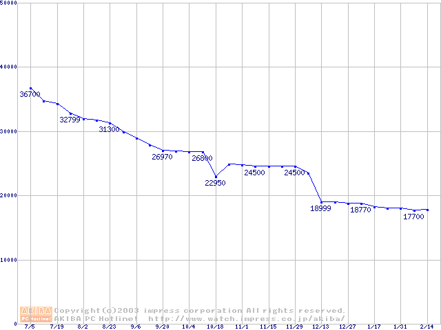 | [↑前グラフ]: | Travelstar 80GN (9.5mm,4200rpm,UltraATA/100,2MB,FDB,40GB/Platter)の最安値推移 |