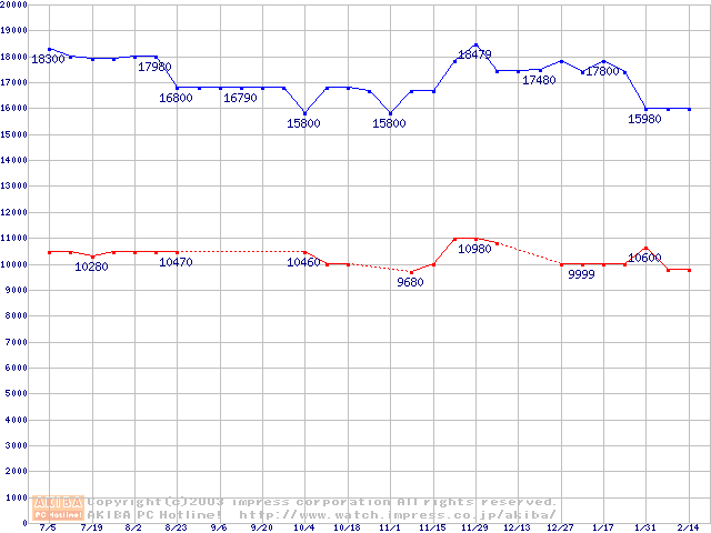 | [↓次グラフ]: | MHT20x0AHシリーズ (9.5mm,5400rpm,UltraATA/100,8MB,FDB,40GB/Platter,FDB)の最安値推移 |