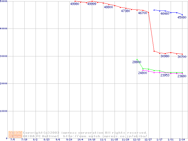 | [↑前グラフ]: | Socket 370 (FC-PGA,FSB 100MHz,L2 128KB,Coppermine)の最安値推移 |
