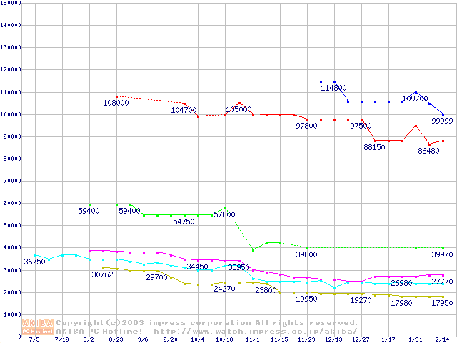 | [↓次グラフ]: | Socket A (OPGA,FSB 400MHz,L2 512KB,Barton)の最安値推移 |