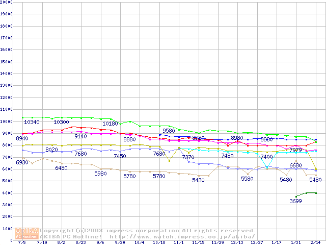 | [↑前グラフ]: | Socket A (OPGA,FSB 333MHz,L2 256KB,Thoroughbred)の最安値推移 |