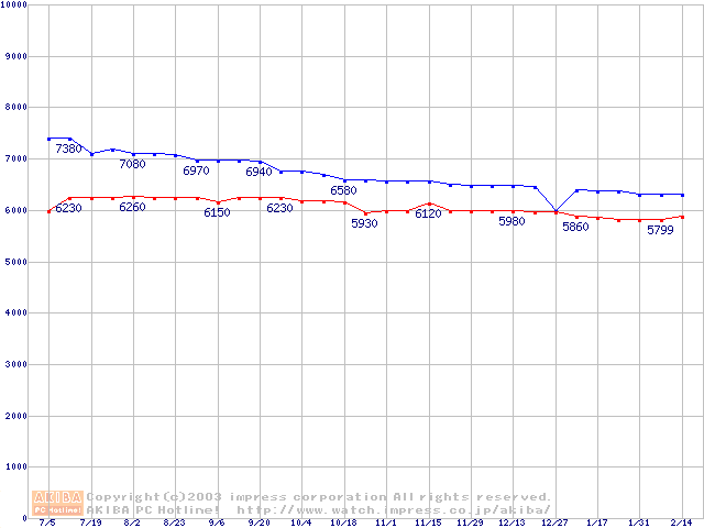 | [↓次グラフ]: | Socket 370 (FC-PGA2,FSB 133MHz,L2 512KB,Tualatin)の最安値推移 |