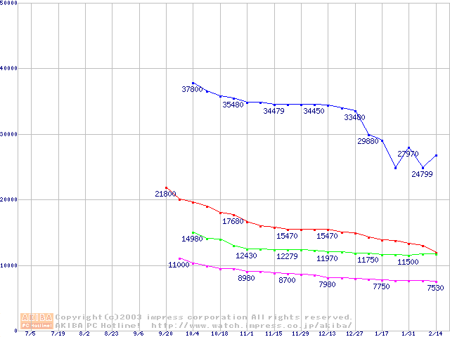 | [↓次グラフ]: | Deskstar 7K250 (7200rpm,UltraATA/100,FDB)の最安値推移 |