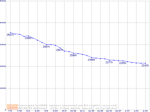 | [↑前グラフ]: | Deskstar 180GXP (7200rpm,2MB,UltraATA/100,FDB)の最安値推移 |