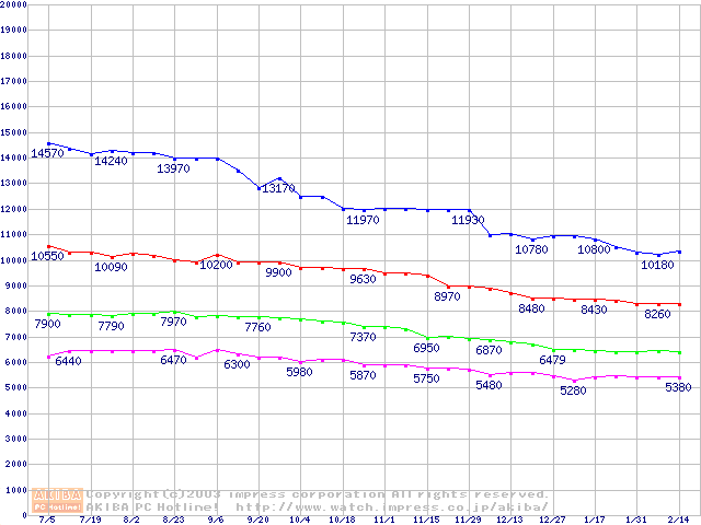 | [↓次グラフ]: | Barracuda 5400.1 (5400rpm,UltraATA/100,2MB,FDB)の最安値推移 |