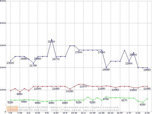 | [↓次グラフ]: | PC2100(DDR266) DDR SDRAM DIMM ECC対応の最安値推移 |