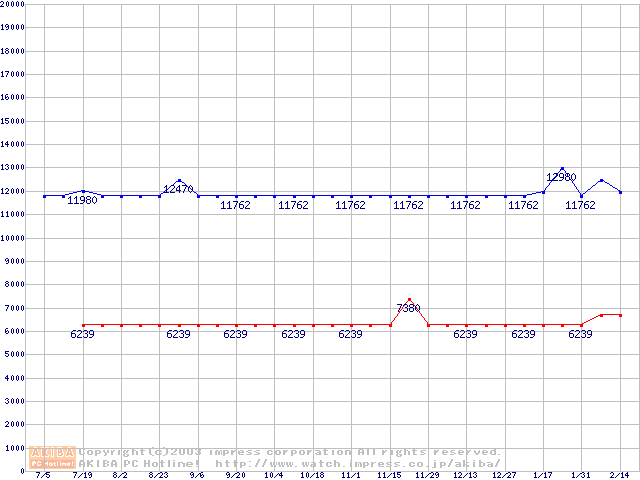 | [↓次グラフ]: | PC3200(DDR400) DDR SDRAM DIMM ECC対応 Registeredタイプの最安値推移 |