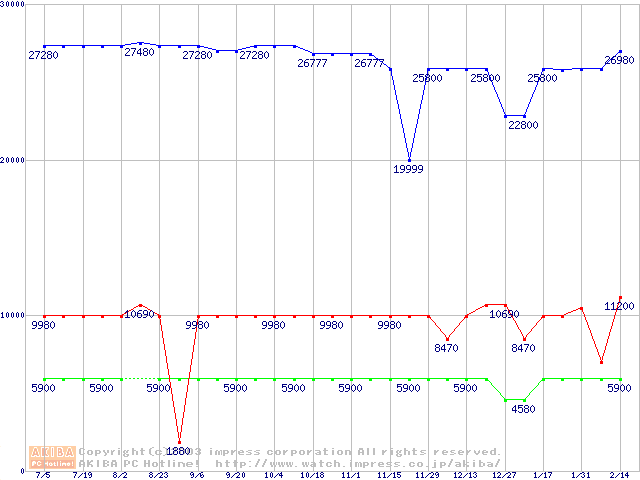 | [↓次グラフ]: | PC1066 DRDRAM RIMM4200(32bit)の最安値推移 |