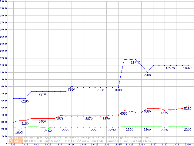 | [↓次グラフ]: | PC100 SDRAM DIMM CasLatency=2 ECC対応の最安値推移 |