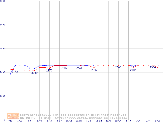 メモリ主要製品(最安値5千円未満)の最安値推移