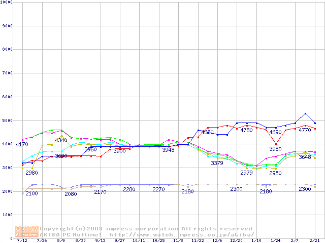 メモリ主要製品(最安値5千円~1万円未満)の最安値推移