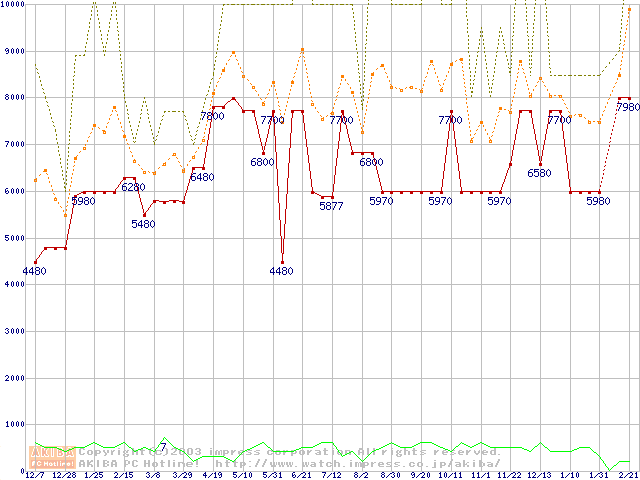 PC133 SDRAM DIMM CasLatency=3 ECC対応の最安値推移