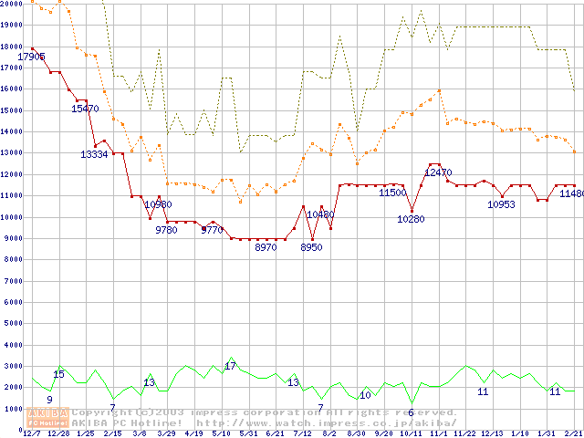 PC2100(DDR266) DDR SDRAM DIMM ECC対応 Registeredタイプの最安値推移
