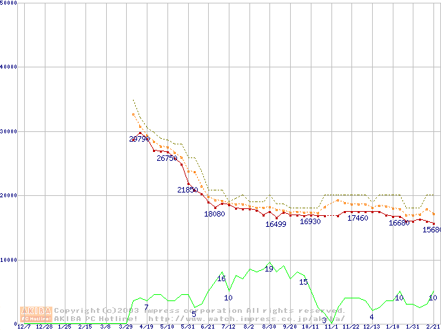 Travelstar 80GN (9.5mm,4200rpm,UltraATA/100,8MB,FDB,40GB/Platter)の最安値推移