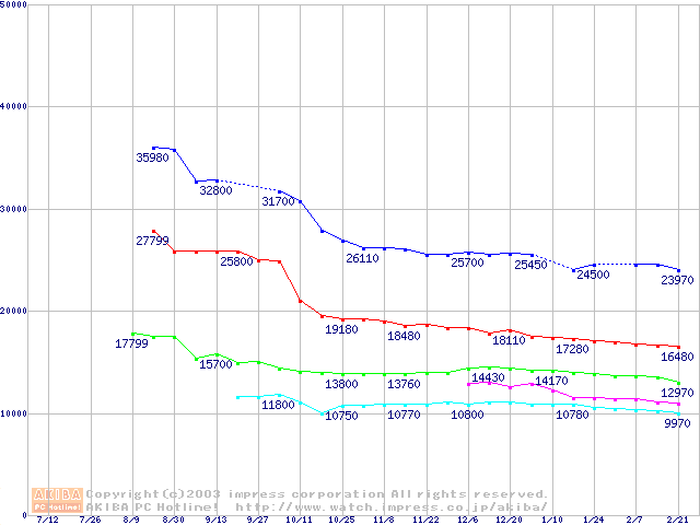 | [↑前グラフ]: | Travelstar 7K60 (9.5mm,7200rpm,UltraATA/100,8MB,FDB,30GB/Platter)の最安値推移 |