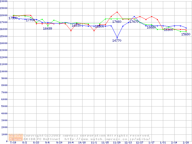| [↑前グラフ]: | 2.5インチHDD 50GB~60GB以下(9.5mm厚,7200rpm)の最安値推移 |