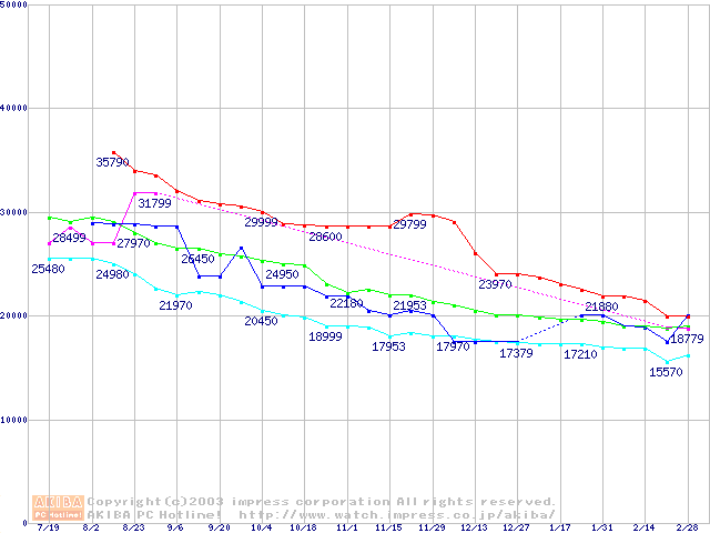| [↓次グラフ]: | HDD主要製品(最安値2万円以上)の最安値推移 |