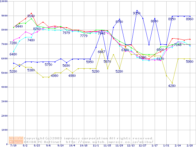 メモリ主要製品(最安値5千円~1万円未満)の最安値推移