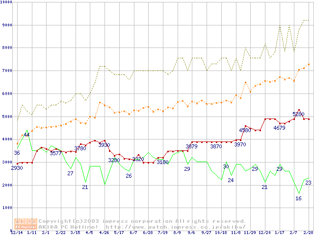 PC100 SDRAM DIMM CasLatency=2の最安値推移