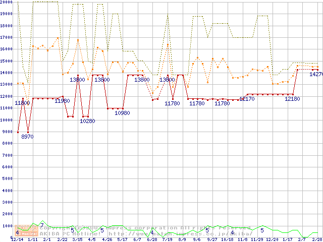 PC133 SDRAM DIMM CasLatency=3 ECC対応 Registeredタイプの最安値推移