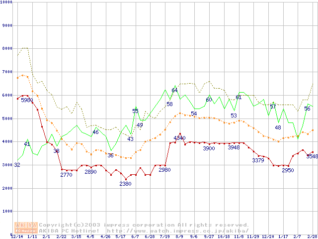PC2700(DDR333) DDR SDRAM DIMMの最安値推移